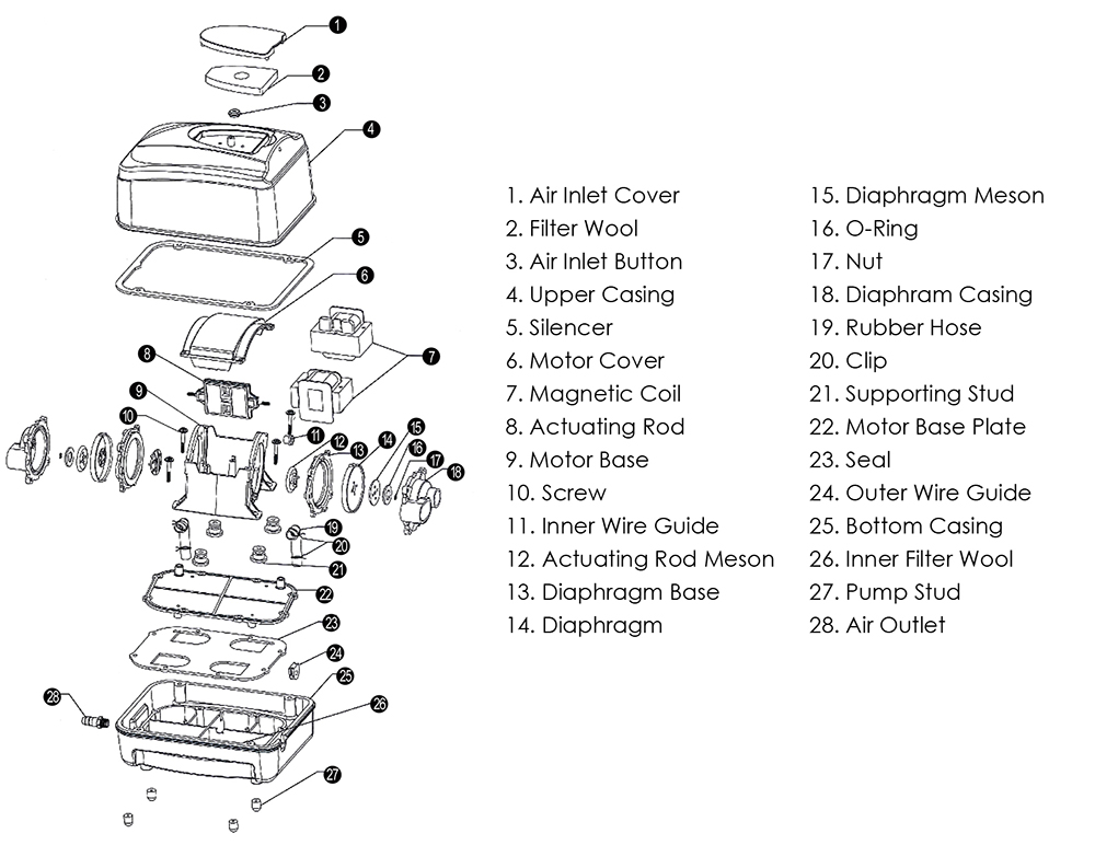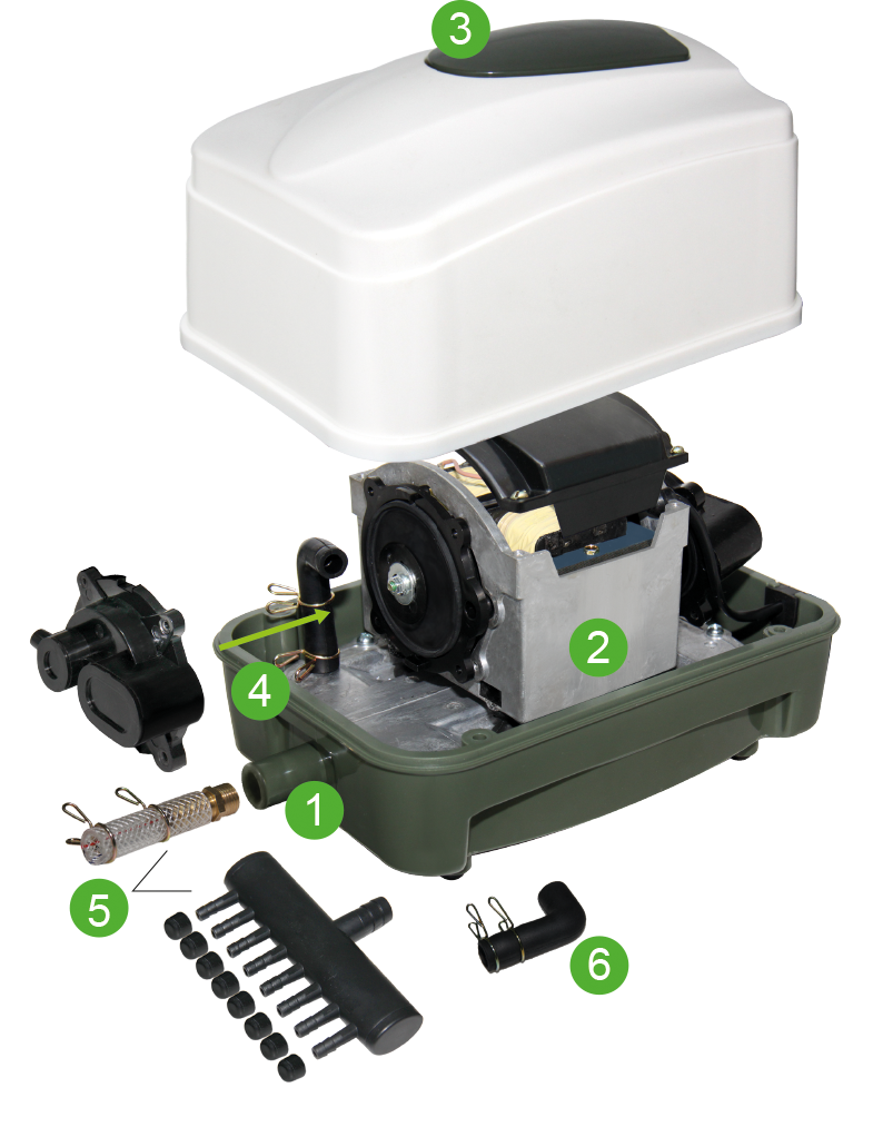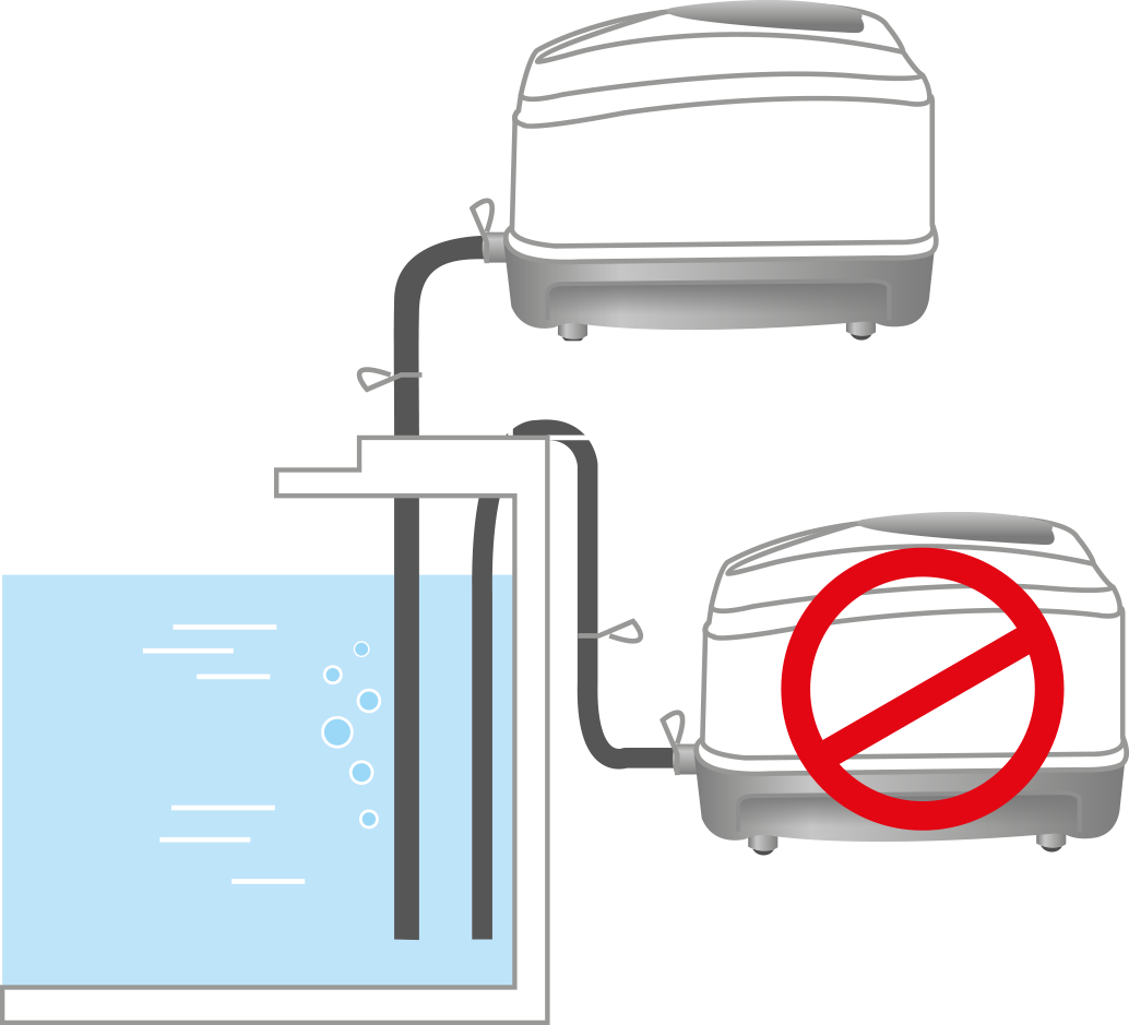 Ponddpro® AIRLAB Air Pump must never be submerged. To prolong product lifespan, it is recommended to avoid installation in a location that expose the unit to possible water, rainwater and snow exposure; it is recommended to be located at a sheltered and dry area with sufficient ventilation. Never installPonddpro® AIRLAB Air Pump below water surface level as it will result in water flowing back into your equipment. In a situation wherebyPonddpro® AIRLAB Air Pump must be installed below water surface level, install check valves into each piece of airline.